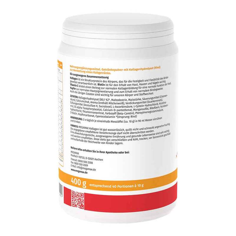 - Megamax Kollagen ist gut wasserlöslich, quillt nicht und schmeckt angenehm fruchtig