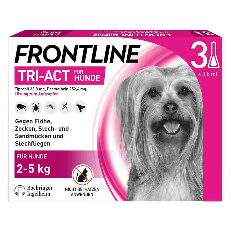 Frontline Tri-Act, Lösung zum Auftropfen für Hunde 2-5 kg, 5-10 kg, 10-20 kg, 20-40 kg, 40-60 kg, Wirkstoffe: Fipronil, Permethrin. Anwendungsgebiete: Zur Behandlung u. Vorbeugung eines Floh- u./o. Zeckenbefalls, wenn gleichzeitig eine repellierende Wirkung (Verhinderung der Blutaufnahme) gegen Sandmücken, Stechfliegen u./o. Stechmücken angezeigt ist. Flöhe: Behandlung u. Vorbeugung eines Flohbefalls mit Ctenocephalides felis u. Vorbeugung eines Flohbefalls mit C. canis. Eine Behandlung verhindert einen erneuten Flohbefall für 4 Wochen. Das Tierarzneimittel kann als Teil einer Behandlungsstrategie gegen Flohallergiedermatitis verwendet werden, sofern dies zuvor durch einen Tierarzt diagnostiziert wurde. Zecken: Behandlung u. Vorbeugung eines Zeckenbefalls (Dermacentor reticulatus, Ixodes ricinus, Rhipicephalus sanguineus). Die Behandlung tötet Zecken ab (D. reticulatus, I. ricinus, R. sanguineus) u. wirkt repellierend gegen Zecken (I. ricinus, R. sanguineus) für 4 Wochen nach der Behandlung. Die repellierende Wirksamkeit gegen D. reticulatus beginnt am Tag 7 nach der Behandlung u. hält für bis zu 4 Wochen an. Stech- u. Sandmücken: Wirkt repellierend gegen Sandmücken (Phlebotomus perniciosus) für 3 Wochen u. gegen Stechmücken (Culex pipiens, Aedes albopictus) für 4 Wochen. Tötet Sandmücken (P. perniciosus) u. Stechmücken (A. albopictus) für 3 Wochen ab. Verringerung des Risikos einer Infektion mit Leishmania infantum für bis zu 4 Wochen. Die Wirkung beruht auf einer indirekten Wirksamkeit des Tierarzneimittels gg. den Vektor. Stechfliegen: Repelliert u. tötet die gemeine Stechfliege (Stomoxys calcitrans) für 5 Wochen. [Mai 2020] Zu Risiken und Nebenwirkungen lesen Sie die Packungsbeilage und fragen Sie Ihren Tierarzt oder Apotheker.