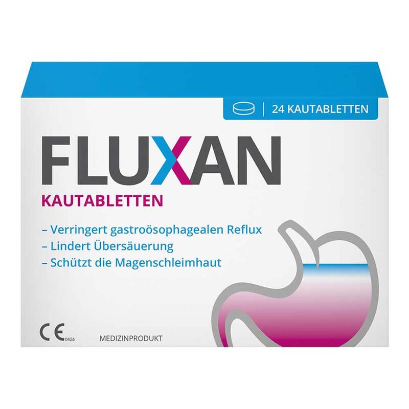 Fluxan® Kautablette Medizinprodukt CE0426. Wirkstoffe: Natriumalginat, Alginsäure, Natriumbicarbonat, Calciumcarbonat. Anwendungsgebiete: Zur Behandlung und Vorbeugung von gastroösophagealem Reflux, brennendem Gefühl, Magenübersäuerung. Zum Schutz der Schleimhäute in Magen und Speiseröhre. Ermöglicht die Kontrolle einer Übersäuerung des Magens und beugt Brennen, Magenschmerzen und damit zusammenhängenden Verdauungsbeschwerden vor. Wirkt unabhängig von der Ursache der Beschwerden; darüber hinaus kann es als Adjuvans bei Gastritis eingesetzt werden. Warnhinweise: Lesen Sie bitte die Gebrauchsanweisung für die ordnungsgemäße Anwendung des Produktes. Kautabletten sind zum einmaligen Gebrauch bestimmt. Nicht über 25 °C aufbewahren. Stand: 01.2020. Ardeypharm GmbH Pharmazeutische Fabrik, Loerfeldstraße 20, 58313 Herdecke.