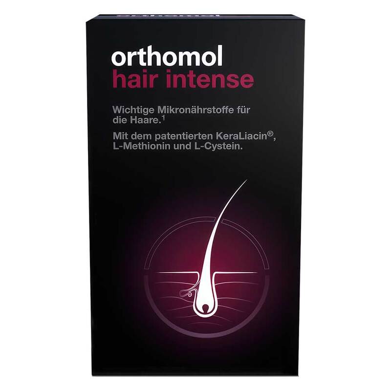 Orthomol Hair Intense ist ein Nahrungsergänzungsmittel und enthält wichtige Mikronährstoffe für das Haar. ¹ Biotin, Selen und Zink tragen zum Erhalt normaler Haare bei . ¹ Kupfer trägt zu einer normalen Haarpigmentierung bei. ¹ Zink, Kupfer und Selen tragen dazu bei, die Zellen vor oxidativem Stress zu schützen . ¹ Thiamin (Vitamin B1), Vitamin B6, Vitamin B12, Biotin, Pantothensäure und Kupfer tragen zu einem normalen Energiestoffwechsel bei . ¹ Vitamin B6 trägt zur normalen Cystein-Synthese bei . ¹ Pantothensäure trägt zur normalen Synthese und zum normalen Stoffwechsel von Steroidhormonen, Vitamin D und einigen Neurotransmittern bei.