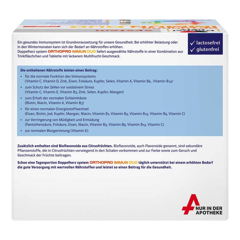Ein gesundes Immunsystem ist Grundvoraussetzung für unsere Gesundheit. Bei erhöhter Belastung oder in den Wintermonaten kann sich der Bedarf an Nährstoffen erhöhen. Doppelherz system Orthopro Immun Duo liefert ausgewählte Nährstoffe in einer Kombination aus Trinkfläschchen und Tablette mit Multifrucht-Geschmack.