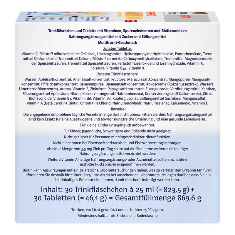 Trinkfläschchen: Wasser, Apfelsaftkonzentrat, Ananassaftkonzentrat, Fructose, Maracujasaftkonzentrat, Mangopüree, Mangosaftkonzentrat, Pfirsichsaftkonzentrat, Bananenpüree, Bananensaftkonzentrat, Kokoscreme (Kokosnussextrakt, Wasser), Limettensaftkonzentrat, Aroma, Vitamin E, Zinkcitrat, Papayasaftkonzentrat, Eisengluconat, Verdickungsmittel Xanthan, Säuerungsmittel Äpfelsäure, Niacin, Konservierungsstoff Natriumbenzoat, Konservierungsstoff Kaliumsorbat, Citrus Bioflavonoide, Vitamin B1, Vitamin B6, Vitamin B2, Kupfergluconat, Süßungsmittel Sucralose, Mangansulfat, Vitamin A (Beta-Carotin), Biotin, Chrom-(III)-Chlorid, Natriummolybdat, Natriumselenat, Kaliumiodid, Vitamin D