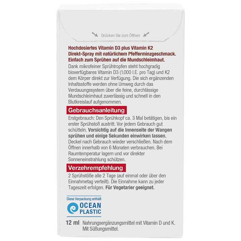 Die aufeinander abgestimmte Vitamin-Kombination für gesunde Muskeln und Knochen. Dank mikrofeiner Sprühtropfen steht hochgradig bioverfügbares Vitamin D3 und K2 (Menachinon-7) dem Körper direkt zur Verfügung. Die Inhaltsstoffe werden ohne Umweg durch das Verdauungssystem über die feine, durchlässige Mundschleimhaut zuverlässig und schnell in den Blutkreislauf aufgenommen.