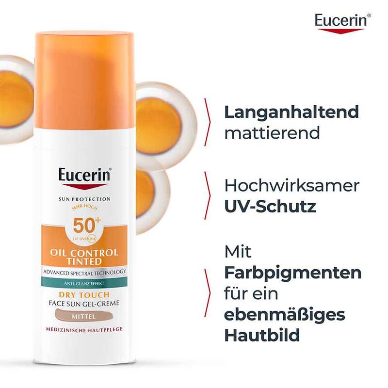 Die Eucerin Oil Control Tinted Face Sun Gel-Creme LSF 50+ Mittel sorgt mit Farbpigmenten für starken Sonnenschutz und einen ebenmäßigen Teint bei unreiner, zu Akne neigender Haut.