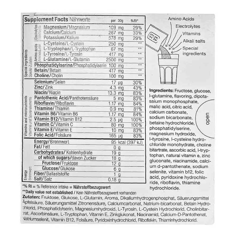 Fruktose, Glukose, L-Glutamin, Aroma, Dikaliumhydrogenphosphat, Säuerungsmittel Äpfelsäure, Säuerungsmittel Zitronensäure, Calciumcarbonat, Natrium-bicarbonat, Betain Hydrochlorid, Phosphatidylserin, Magnesiumhydroxid, L-Tyrosin, L-Cystein Hydrochlorid, Cholinbitartrat, Ascorbinsäure, L-Tryptophan, Vitamin E, Zinkglukonat, Niacinamid, Calcium-D-Pantothenat, Natriumselenit, Vitamin B12, Folsäure, Pyridoxinhydrochlorid, Riboflavin, Thiaminhydrochlorid.