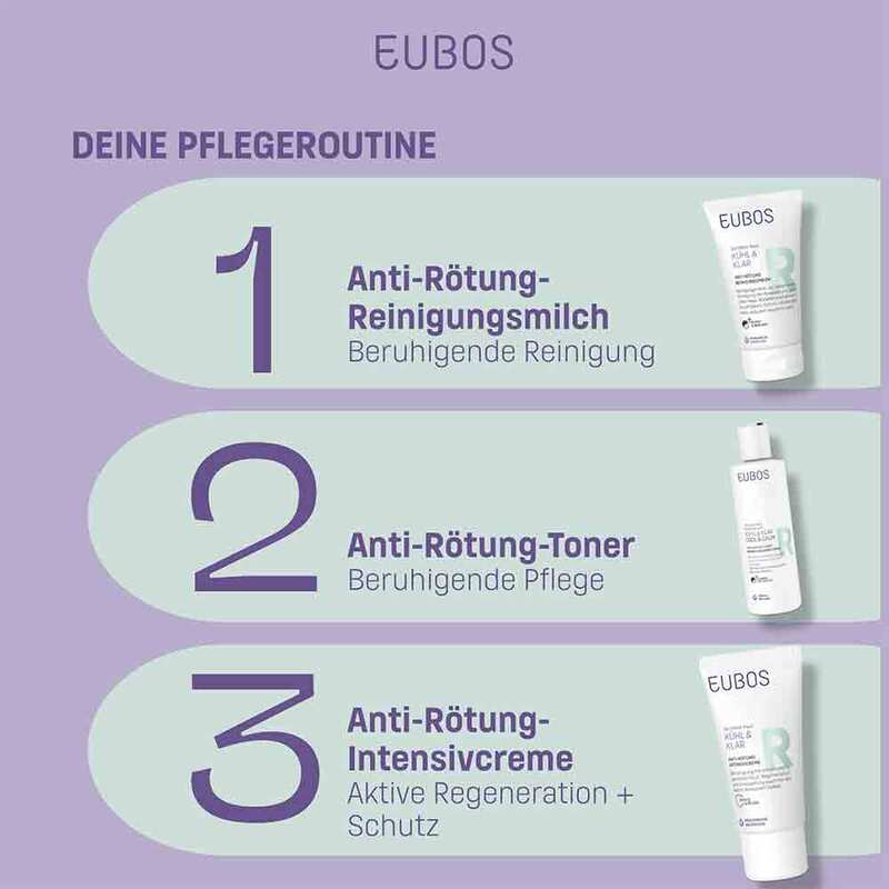 Die Eubos Kühl & Klar Anti-Rötung Intensivcreme ist ein medizinisches Pflegeprodukt für trockene Haut bei Rosacea. Die Creme ist ideal zur Regeneration und Erneuerung für die Nacht. Der Aktivstoff Hydra Synol DOI füllt die Feuchtigkeitsdepots nachweislich auf. Das enthaltene antibakterielle Mikrosilber stärkt und stabilisiert die Mikroflora. Der Phyto-Aktivstoffkomplex mit italienischer Immortelle hemmt Entzündungsvorgänge und stärkt die Gefäße. Rötungen und Schwellungen werden sichtbar reduziert. Die Creme eignet sich Therapie begleitend bei Couperose und Rosacea und wurde dermatologisch getestet.