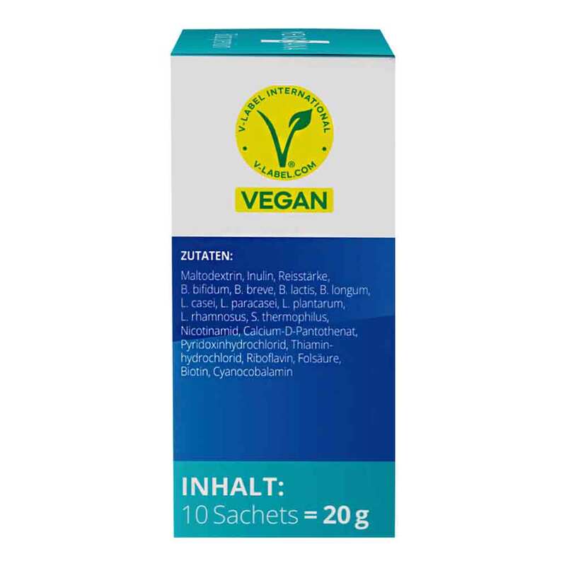 Maltodextrin, Inulin, Reisstärke, B. bifidum, B. breve, B. lactis, B. longum, L. casei, L. paracasei, L. plantarum, L. rhamnosus, S. thermophilus, Nicotinamid, Pantothensäure, Riboflavin, Pyridoxin HCL, Thiamin, Folsäure, Biotin, Cyanocobalamin.