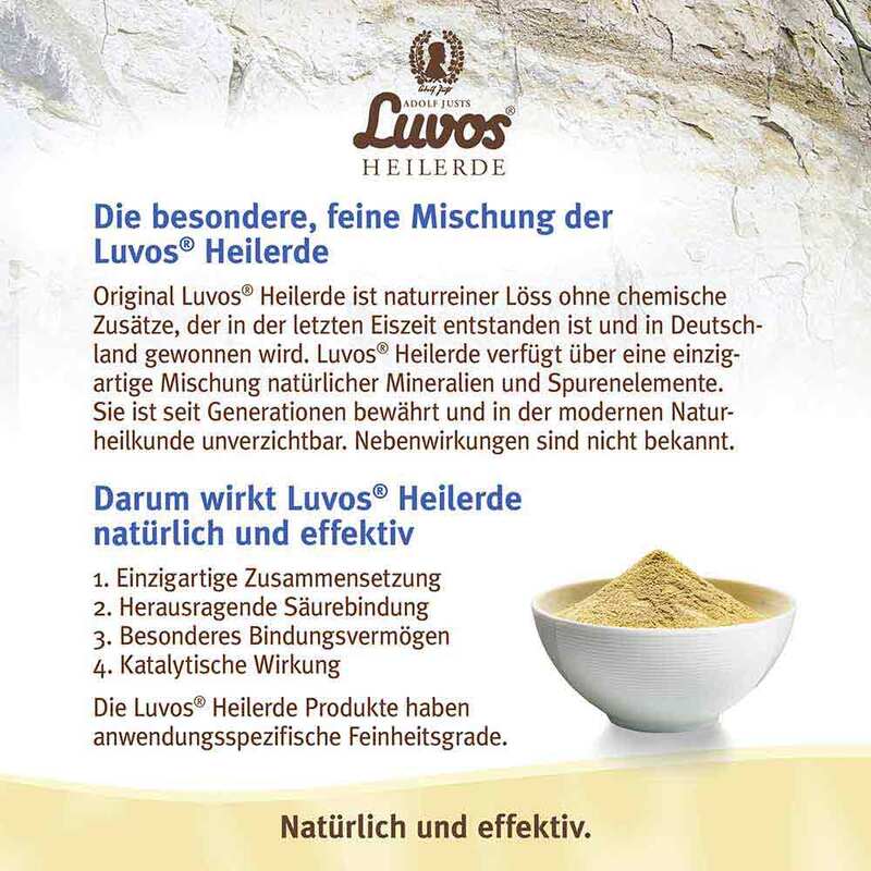 Luvos-Heilerde hat eine optimale mineralische Struktur. Sie wirkt rein physikalisch über ihre große Oberfläche und die bei der Trocknung entstehende Saugwirkung von innen nach außen. Fett, Talg, Wundsekrete und andere Flüssigkeiten sowie darin gelöste und ungelöste Stoffe und Bakterien werden gebunden. Hierauf beruht die intensive Wirkung von Luvos-Heilerde auf die Haut.