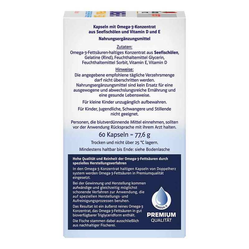 Doppelherz system Omega-3 Premium 1500 System Kapseln enthalten ein hochgereinigtes Konzentrat aus Seefischölen mit den wertvollen Omega-3-Fettsäuren EPA und DHA in Kombination mit Vitamin D3 und E. Durch die hohe Konzentration an Omega-3-Fettsäuren liefern bereits 2 Kapseln täglich 1.500 mg Omega-3-Fettsäuren, davon 780 mg EPA und 495 mg DHA. Dadurch kann auch bei einem erhöhten Bedarf eine gute Versorgung mit den wertvollen Omega-3-Fettsäuren unterstützt werden.