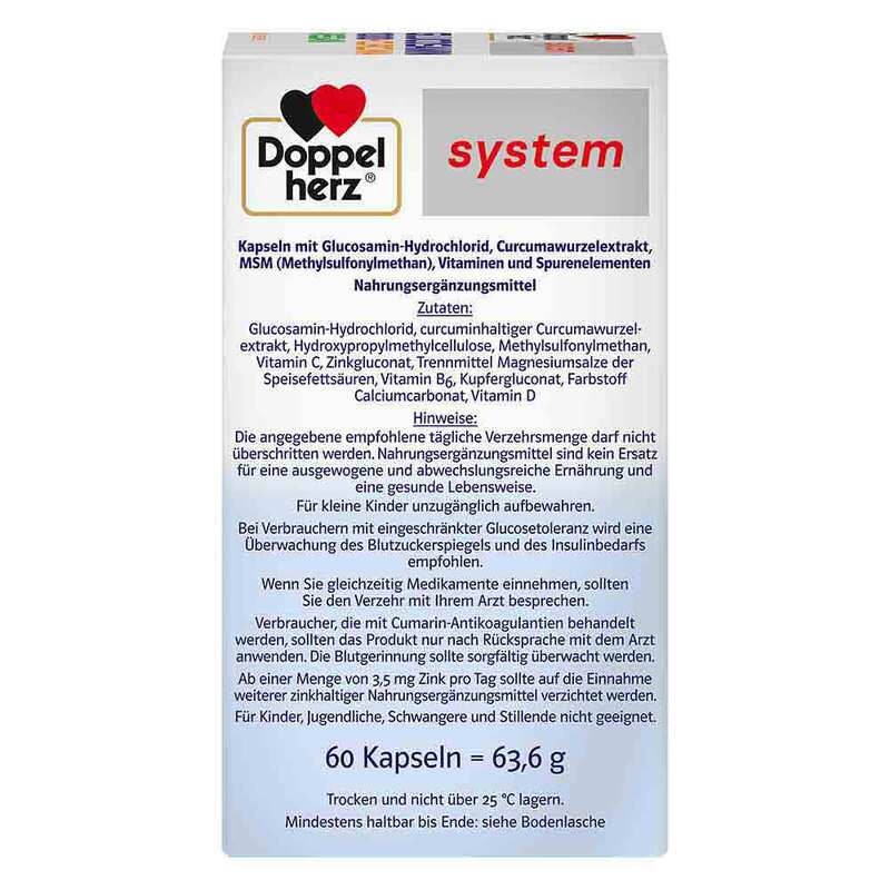 Doppelherz system Glucosamin 1.000 + Curcuma vegan enthält eine spezielle Kombination der lebenswichtigen Mikronährstoffe Kupfer, Zink, Vitamin C, Vitamin B6 und Vitamin D. Zusätzlich sind 1.000 mg Glucosamin-Hydrochlorid, 200 mg MSM (Methylsulfonylmethan) und 500 mg Curcumawurzelextrakt bei Einnahme von 2 Kapseln enthalten.