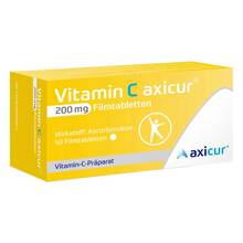 Vitamin C axicur® 200 mg Filmtabletten Wirkstoff: Ascorbinsäure. Anwendungsgebiete: Vitamin-C-Präparat zur Behandlung von Vitamin-C-Mangel-Krankheiten. Zur Vorbeugung eines Vitamin-C-Mangels, wenn die ausreichende Zufuhr durch Ernährung nicht gesichert ist. Enthält Lactose. Zu Risiken und Nebenwirkungen lesen Sie die Packungsbeilage und fragen Sie Ihre Ärztin, Ihren Arzt oder in Ihrer Apotheke. axicorp Pharma GmbH, 61381 Friedrichsdorf. Stand: April 2022