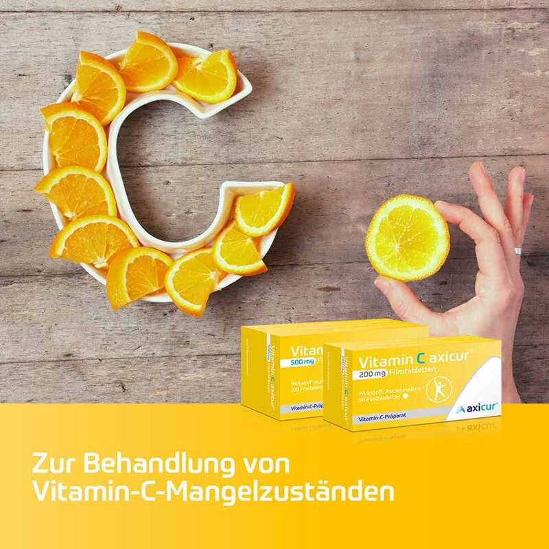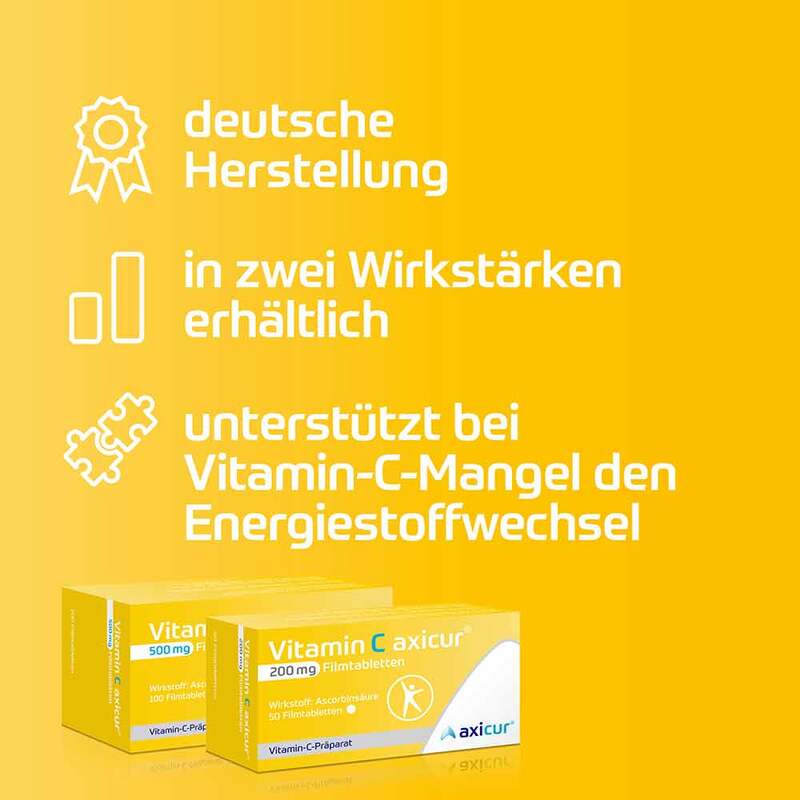 Der Wirkstoff Ascorbinsäure, auch Vitamin C genannt, dient zur Prophylaxe und Therapie von Vitamin-C- Mangelkrankheiten. Vitamin C axicur® ist in zwei Wirkstärken erhältlich: 200 mg und 500 mg. Vitamin C axicur® ist mit einer Wirkstärke von 200 mg in einer Packungsgröße von 50 und 100 Filmtabletten und in einer Wirkstärke von 500 mg in einer Packungsgröße von 100 Filmtabletten erhältlich.