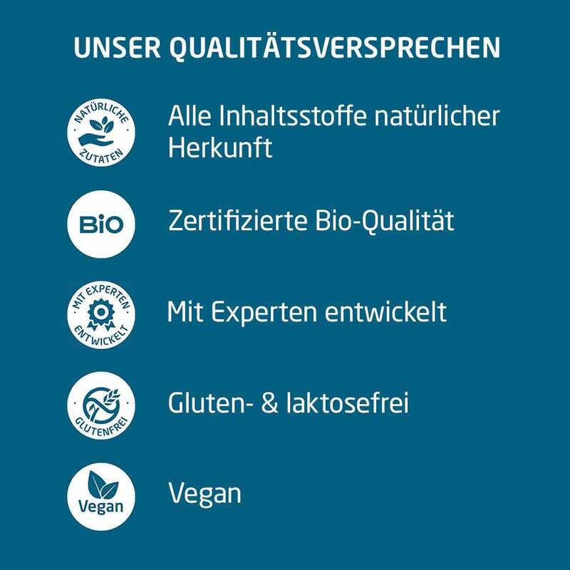 Die angegebene empfohlene tägliche Verzehrsmenge darf nicht überschritten werden. Nahrungsergänzungsmittel sind kein Ersatz für eine ausgewogene und abwechslungsreiche Ernährung und eine gesunde Lebensweise.