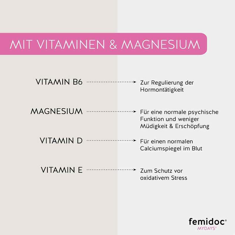 Femidoc MyDays enthält die 3 traditionell verwendeten Frauenkräuter - Frauenmantel, Hirtentäschel und Schafgarbe kombiniert mit Vitamin B6, Vitamin D, Vitamin E und Magnesium.