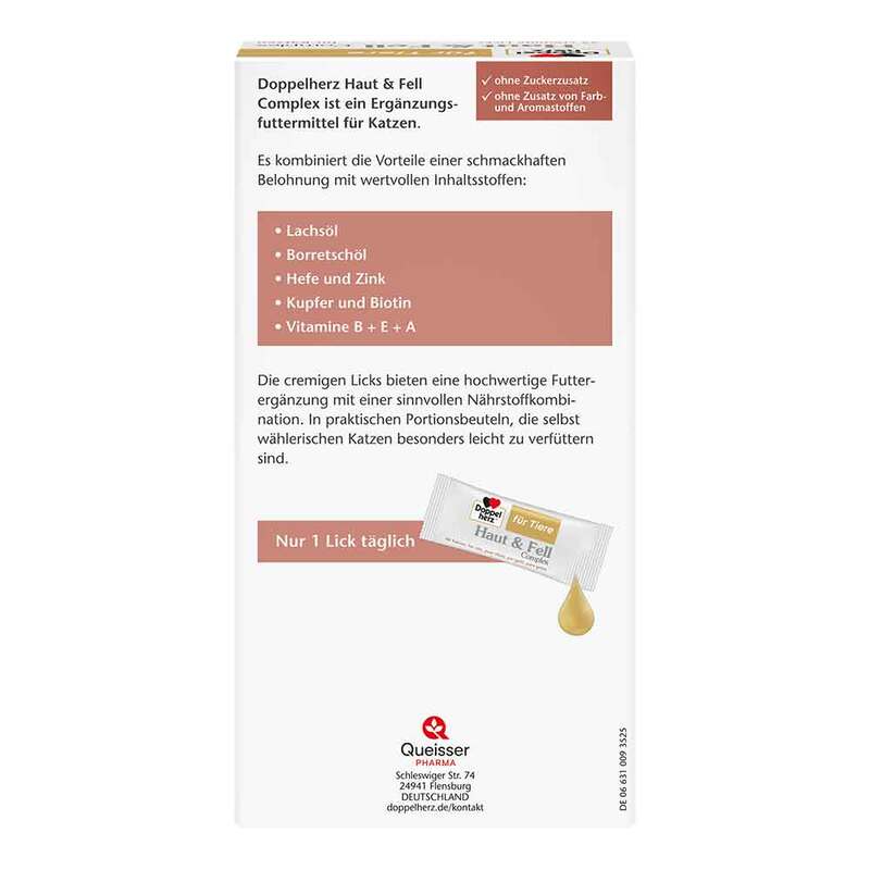 Bei den Doppelherz Haut & Fell Complex für Katzen handelt es sich um ein physiologisch sinnvoll zusammengesetztes und tierärztlich entwickeltes Ergänzungsfuttermittel. Bitte dosieren Sie die Licks nach der Dosierungsempfehlung.