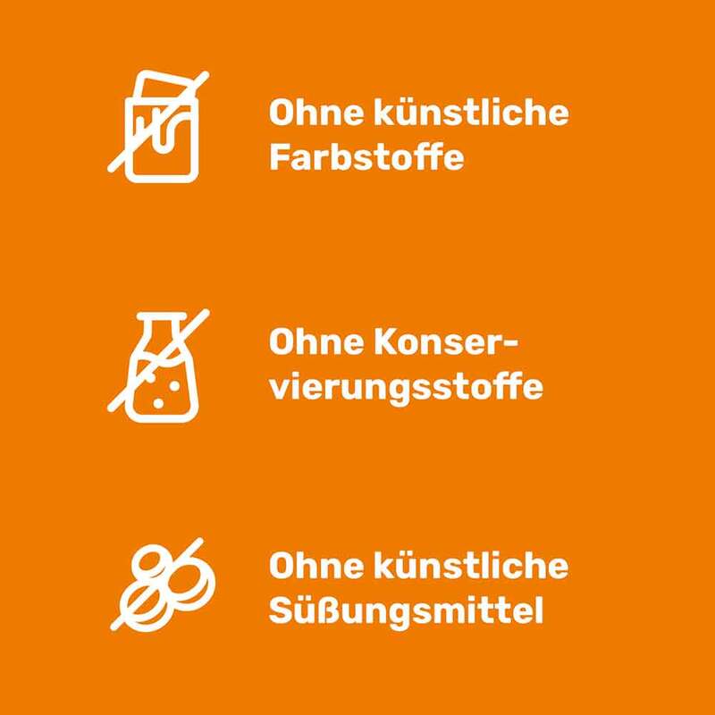Süßungsmittel Sorbit, Xylit und Sucralose; L-Ascorbinsäure, Nicotinamid, färbendes Lebensmittel (Saflorkonzentrat), Trennmittel Speisefettsäuren, D-alpha-Tocopherolacetat, Trennmittel Magnesiumsalze der Speisefettsäuren, Zinkcitrat, Hefe-Beta-Glucan (Saccharomyces cerevisiae), Hagebuttenpulver, Farbstoff Anthocyane, Calcium-D-pantothenat, Säureregulator Äpfelsäure, Retinylacetat, Pyridoxinhydrochlorid, D-Biotin, Riboflavin, Thiaminmononitrat, Aroma, Cholecalciferol, Cyanocobalamin, Pteroylmonoglutaminsäure, Kaliumjodid