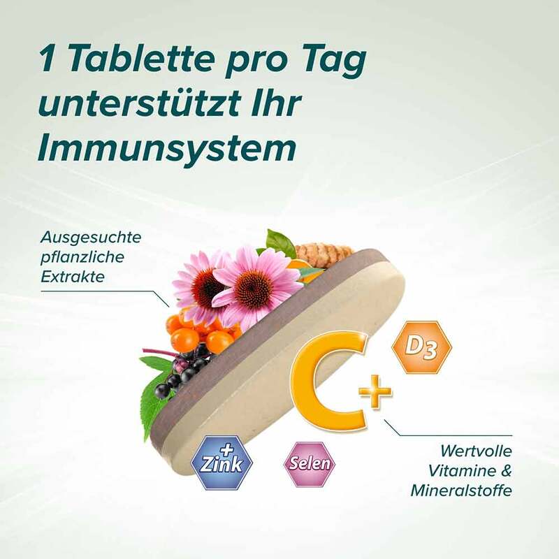 Vitamin C (als L-Ascorbinsäure), Trennmittel Cellulose, Bambusfaser, Holunderextrakt (Sambucus nigra L., Frucht), Apfelfaser, Maltodextrin, Verdickungsmittel Xanthan, Sanddornextrakt (Hippophae rhamnoides L., Frucht), Sonnenhutextrakt (Echinacea purpurea L. Moench, Wurzel), Curcumaextrakt (Curcuma longa L., Wurzel), Zink (als Zinkcitrat), Selen (als Selen-angereicherte Hefe), Trennmittel Magnesiumsalze der Speisefettsäuren, Vitamin D (als Cholecalciferol), Stabilisatoren Hydroxypropylmethylcellulose und Hydroxypropylcellulose, Trennmittel Talkum, pflanzliche Öle (Palmkern und Raps in veränderlichen Gewichtsanteilen)