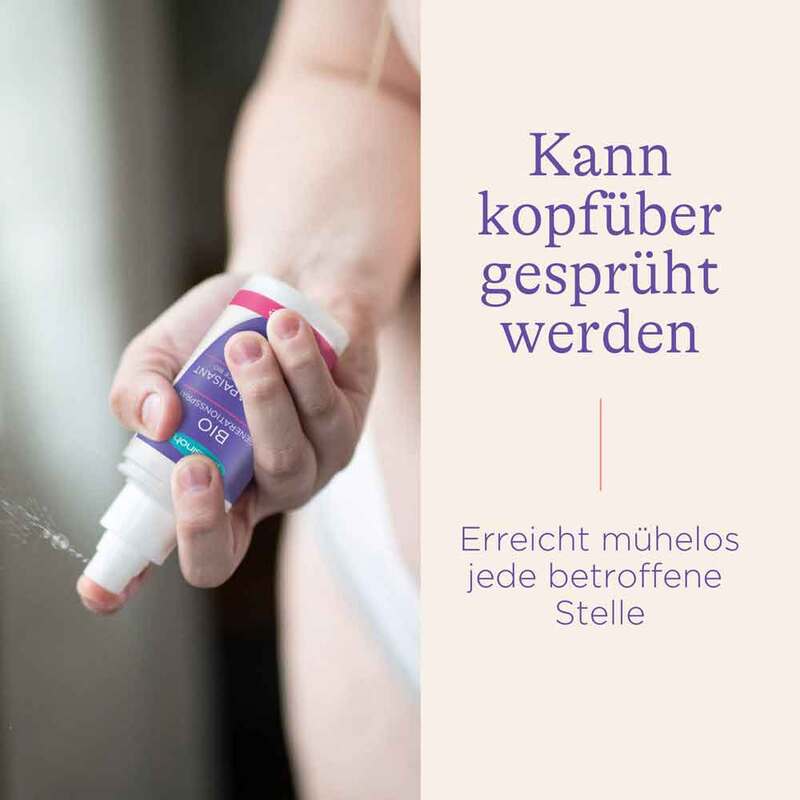 Das BIO Regenerationsspray kann direkt nach der Geburt angewendet werden und wird bei Beschwerden so oft wie erforderlich direkt auf den Dammbereich gesprüht. Der 360° Sprühkopf macht es möglich, auch kopfüber aus jedem Winkel zu sprühen und somit jede betroffene Stelle mühelos zu erreichen. Das BIO Regenerationsspray kann direkt auf die Haut oder auf eine Wochenbettvorlage gesprüht werden. Für einen extra kühlenden Effekt kann das Spray im Kühlschrank aufbewahrt werden.