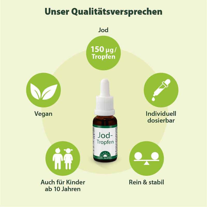 Dr. Jacob’s Jod-Tropfen enthalten pro Tropfen (1 Portion) 150 µg Jod. Wer 1–2 Jod-Tropfen am Tag zu sich nimmt, kann seine tägliche Versorgung sicherstellen und eine bestehende Unterversorgung korrigieren.