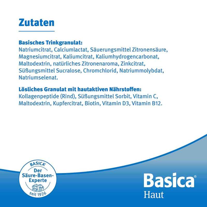 Lösliches Granulat mit hautaktiven Nährstoffen: Kollagenpeptide (Rind), Süßungsmittel Sorbit, Vitamin C, Maltodextrin, Kupfercitrat, Biotin, Vitamin D3, Vitamin B12.