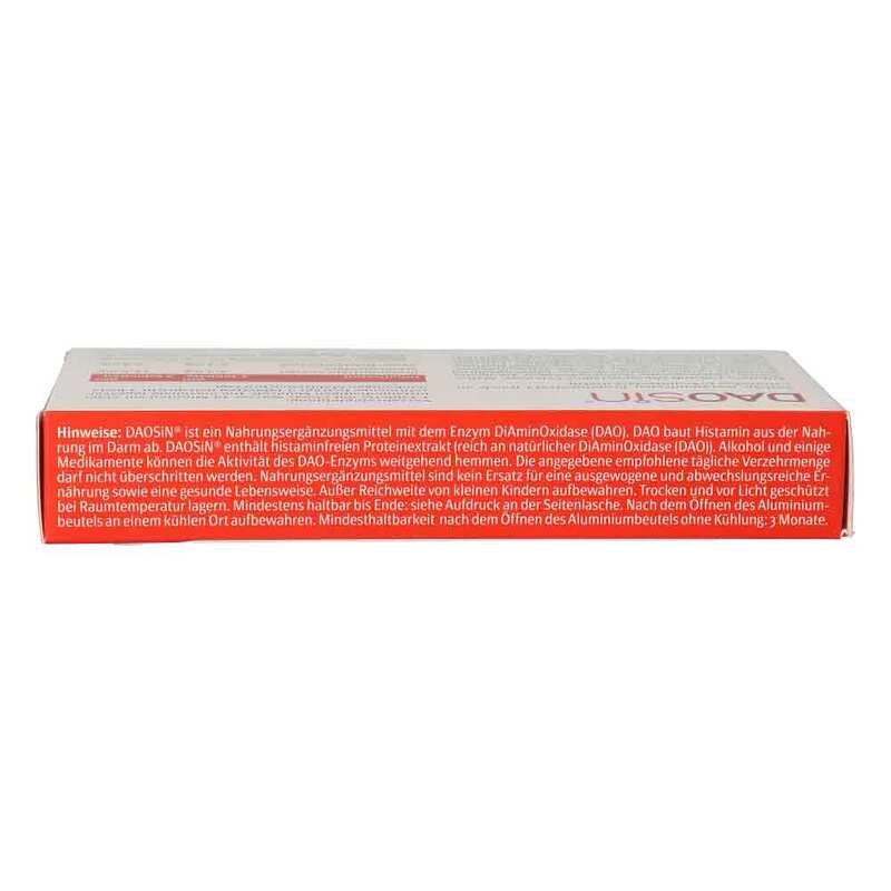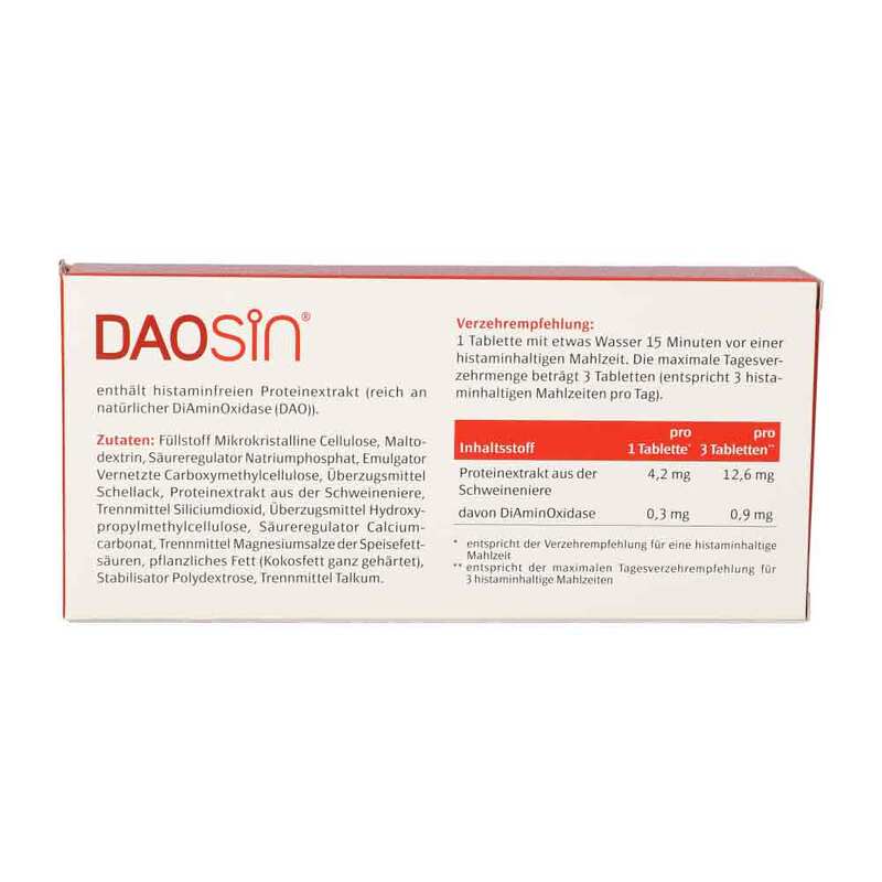 Nahrungsergänzungsmittel mit dem Enzym DiAminOxidase (DAO). DAO ergänzt das körpereigene Enzym zum Histaminabbau im Darm. Enthält histaminfreien Proteinextrakt (enthält natürliche DiAminOxidase). Alkohol und einige Medikamente können die Aktivität des DAO-Enzyms weitgehend hemmen.
