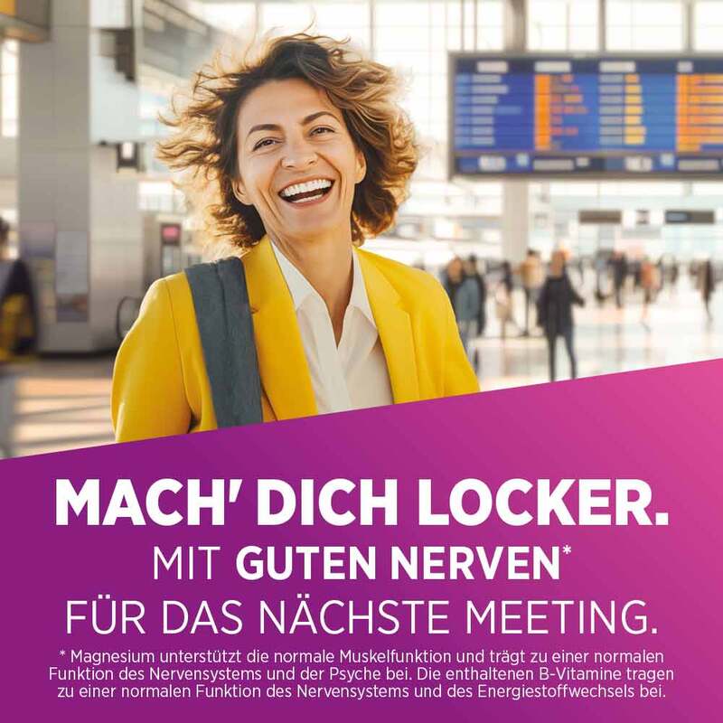 Die besondere Magnesium-Komposition vereint schnellfreisetzendes mit hochdosiertem Depot-Magnesium und wichtigen B-Vitaminen (B1, B2, B6 und B12), die eine normale Funktion des Nervensystems unterstützen. Zusätzlich trägt Magnesium zur Entspannung der Muskulatur bei.