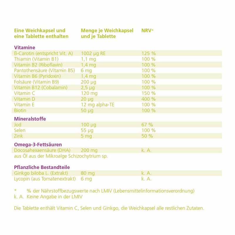 Weichkapsel: Öl aus der Mikroalge Schizochytrium sp; modifizierte Stärke, Feuchthaltemittel: Glycerin, Geliermittel: Carrageen; Sojaöl; Emulgator: Mono- und Diglyceride von Speisefettsäuren, Trägerstoff: Sojalecithin, Vitamin E, Calcium-D-Pantothenat, Beta-Carotin, Lycopin (aus Tomatenextrakt), Zinkoxid, Riboflavin, Pyridoxinhydrochlorid, Farbstoff E172, Thiaminmononitrat, Folsäure, Kaliumjodid, Biotin, Vitamin D3, Farstoff E133, Cyanocobalamin.