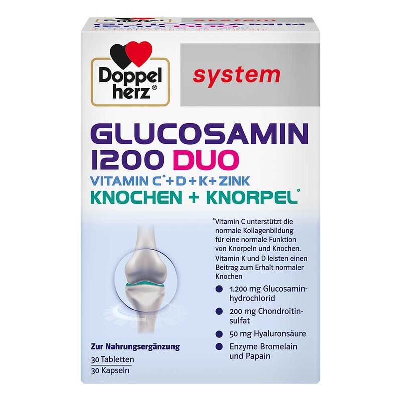 Doppelherz System Glucosamin 1200 Duo enthält Vitamin C, Vitamin D, Vitamin K* und die Spurenelemente Zink, Kupfer, Mangan und Selen. Zusätzlich sind 1200 mg Glucosaminhydrochlorid, 200 mg Chondroitinsulfat, 50 mg Hyaluronsäure sowie die Enzyme Bromelain und Papain enthalten.