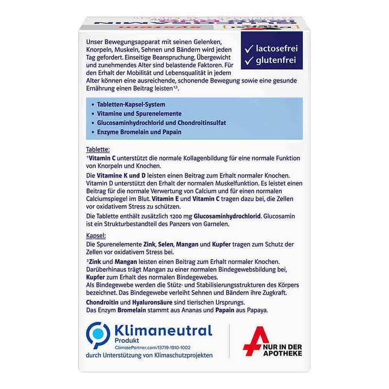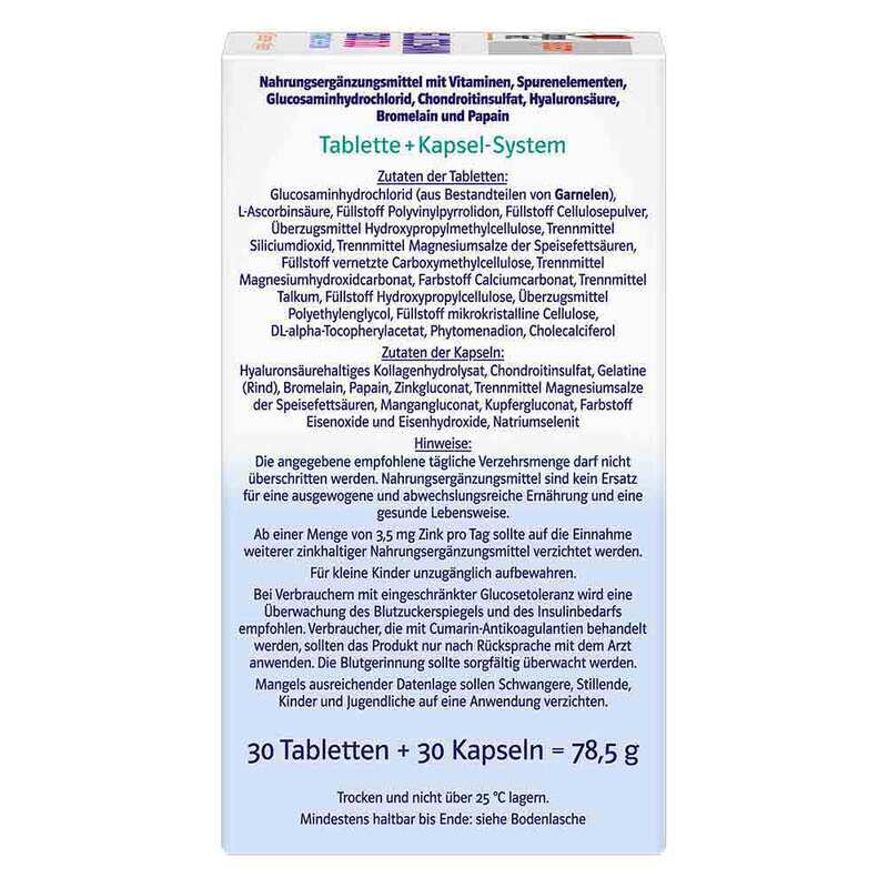 - Nahrungsergänzungsmittel mit Vitaminen, Spurenelementen, Glucosaminhydrochlorid, Chondroitinsulfat, Hyaluronsäure, Bromelain und Papain