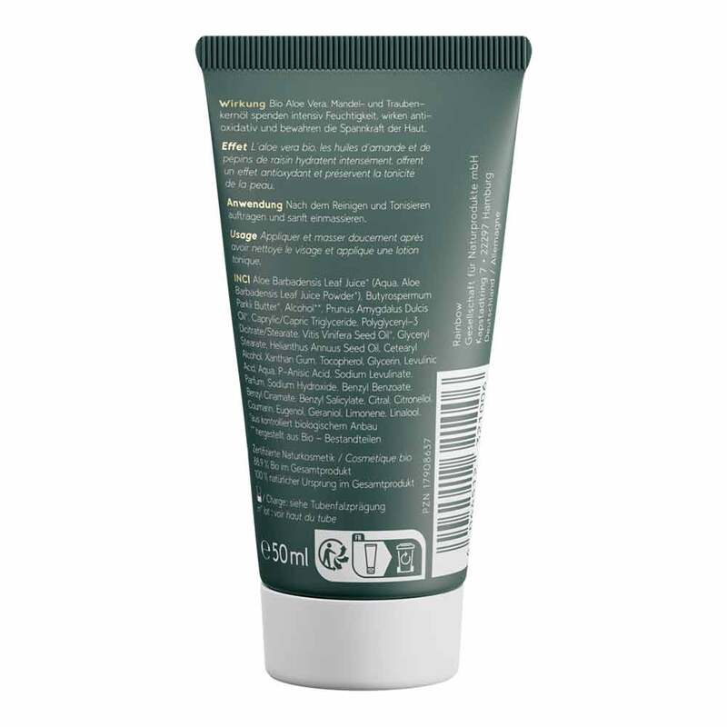 Die zarte Creme spendet intensiv natürliche Feuchtigkeit und fördert die Regeration Ihrer Haut. Reines Bio Mandel- und Traubenkernöl wirken antioxidativ, schützen vor schädlichen Umwelteinflüssen und bewahren die Spannkraft und Geschmeidigkeit.
