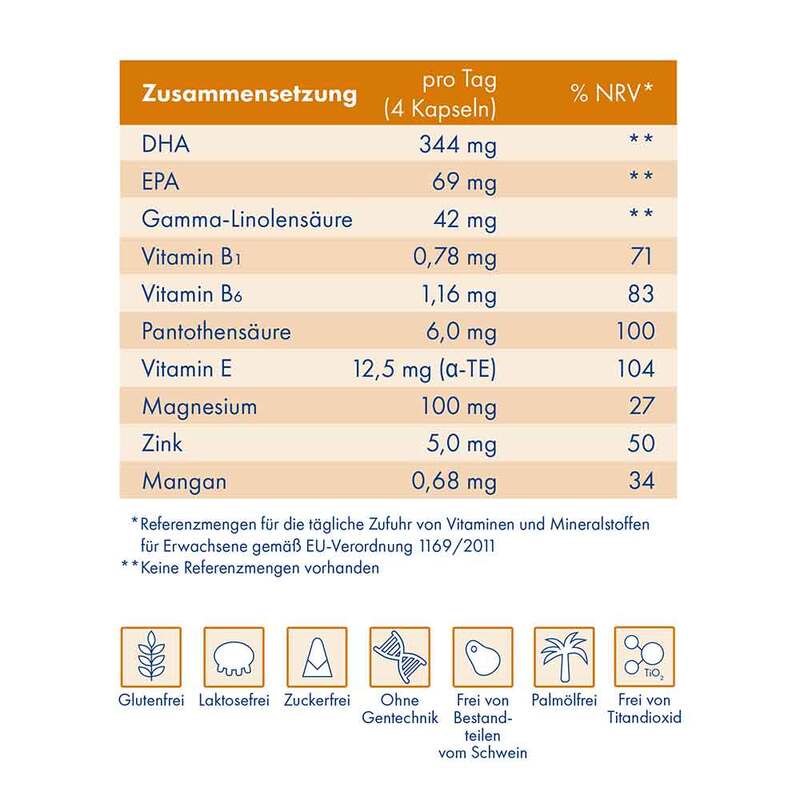 Fischölkonzentrat mit Omega-3-Fettsäuren; Kapselhülle: Gelatine; Borretschsamenöl; Magnesiumoxid; Feuchthaltemittel: Glycerin, Sorbitol; Wasser; Trennmittel: Bienenwachs; Emulgator: Sonnenblumenlecithin; D-α-Tocopherol (Vitamin E); Zinkgluconat; Sonnenblumenöl; Calciumpantothenat; Zinkoxid; Farbstoff: Eisenoxid; Mangansulfat; Pyridoxin-Hydrochlorid (Vitamin B₆); Thiamin-Mononitrat (Vitamin B₁).