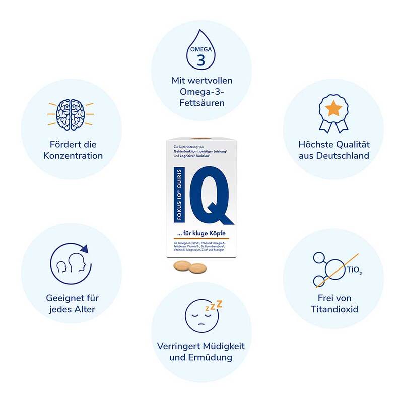 Täglich vier Kapseln mit ausreichend Flüssigkeit zum Frühstück einnehmen. FOKUS IQ® ist für eine dauerhafte Einnahme geeignet.
