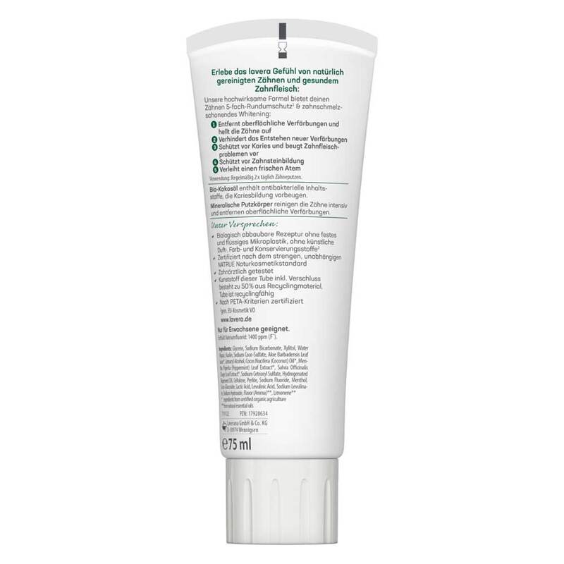 Erlebe das lavera Gefühl von natürlich gereinigten Zähnen und gesundem Zahnfleisch: LAVERAs hochwirksame Formel bietet deinen Zähnen einen 5-fach-Rundumschutz1 & & zahnschmelzschonendes Whitening:
