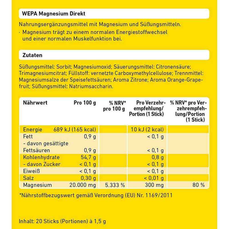 Süßungsmittel: Sorbit; Magnesiumoxid; Säuerungsmittel: Citronensäure; Trimagnesiumcitrat; Füllstoff: vernetzte Carboxymethylcellulose; Trennmittel: Magnesiumsalze der Speisefettsäuren; Aroma Zitrone; Aroma Orange-Grapefruit; Süßungsmittel: Natriumsaccharin.
