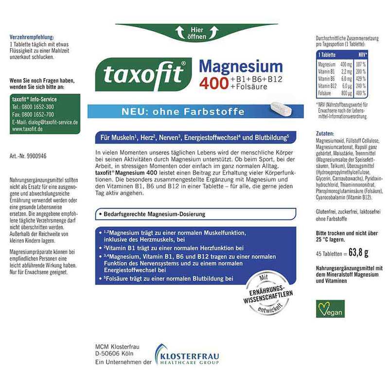 Taxofit Magnesium 400 + B1 + B6 + B12 + Folsäure Tabletten, 45 St
