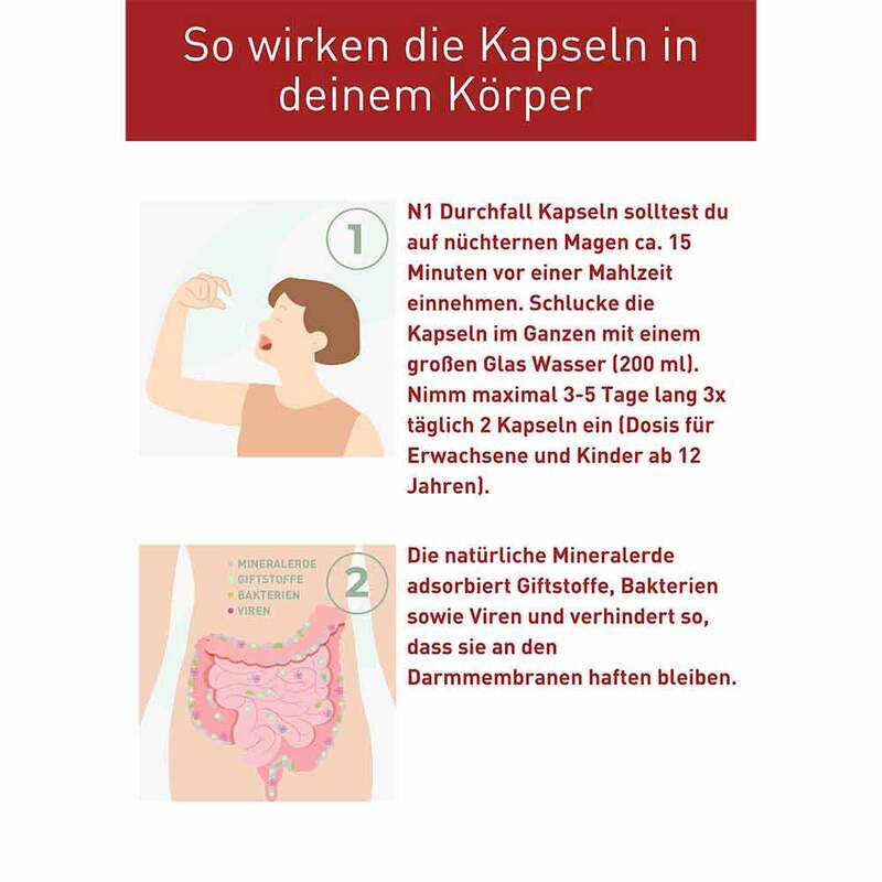 N1 Durchfall Kapseln ist ein Medizinprodukt zur Behandlung akuter Diarrhöe (Durchfall) in Kombination mit der Standard-Rehydratationstherapie. Die Kapseln verkürzen die Dauer des Durchfalls und lindern Bauchschmerzen sowie den Druck der durch überschüssige Gase im Magen-Darm-Trakt verursacht wird.Die Wirkstoffe in den N1 Durchfall Kapseln werden vom Darm nicht aufgenommen. Natürliche Mineralerde adsorbiert Toxine, Bakterien und Viren und verhindert so, dass sie an den Darmmembranen haften bleiben.
