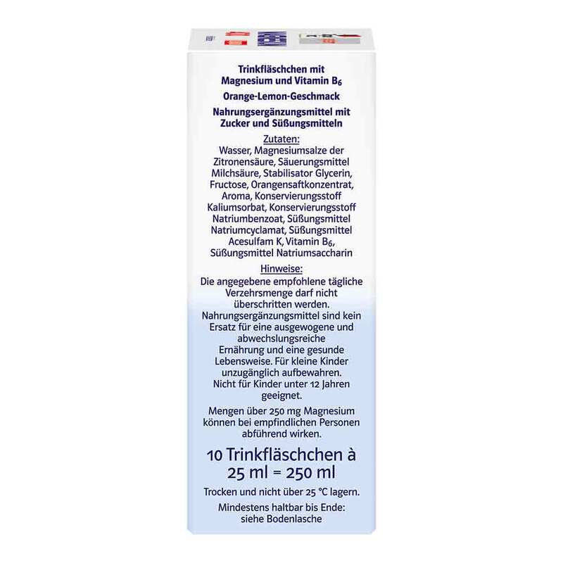 Wasser, Magnesiumsalze der Zitronensäure, Säuerungsmittel Milchsäure, Stabilisator Glycerin, Fructose, Orangensaftkonzentrat, Aroma, Konservierungsstoff Kaliumsorbat, Konservierungsstoff Natriumbenzoat, Süßungsmittel Natriumcyclamat, Süßungsmittel Acesulfam K, Pyridoxinhydrochlorid, Süßungsmittel Natriumsaccharin.