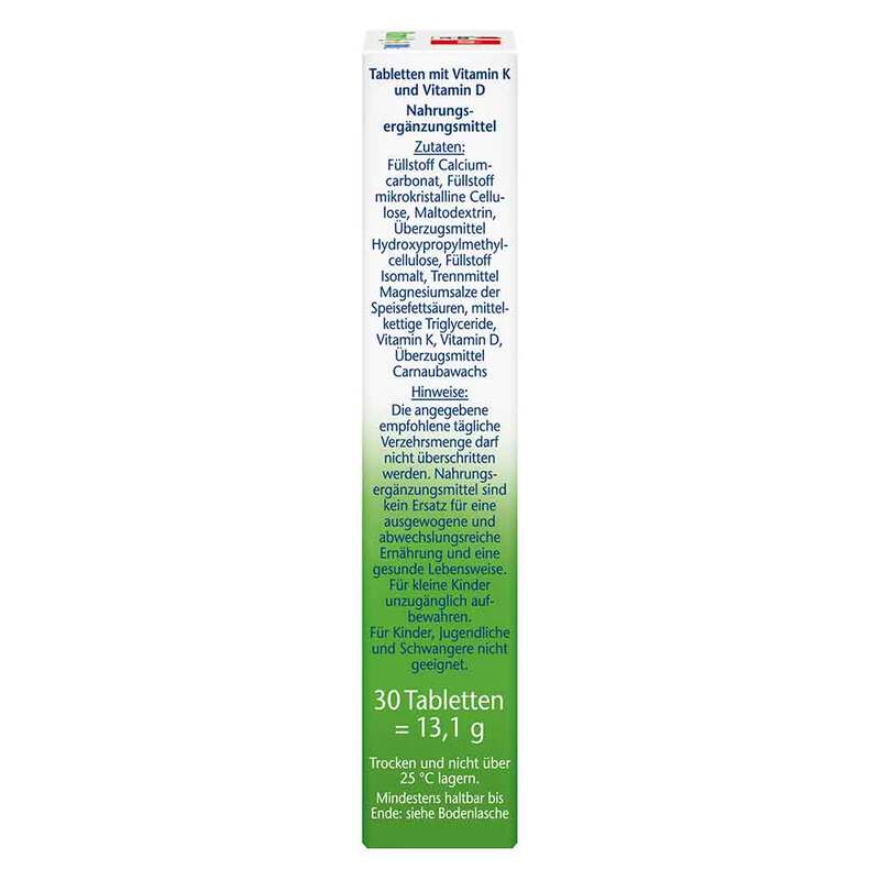 Eine Tablette enthält 100 μg Vitamin K in Form von Menachinon (MK-7). Das ist ein hochwertiges Vitamin K2 und kann vom menschlichen Körper gut aufgenommen werden. Vitamin K trägt zudem zur normalen Blutgerinnung bei. Daneben enthält die Tablette 25 μg Vitamin D. Dies entspricht 1000 I.E. (Internationale Einheiten). Vitamin D leistet zudem einen Beitrag zum Erhalt einer normalen Muskelfunktion und trägt zum Erhalt einer normalen Funktion des Immunsystems bei.