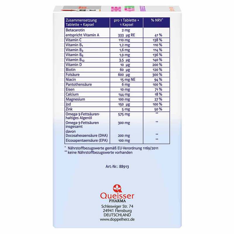 Das Tablette+Kapsel-System von Doppelherz besteht aus einer gut schluckbaren Tablette und einer leicht einzunehmenden Kapsel. Beide zusammen liefern eine umfangreiche Nährstoff-Kombination, um die Versorgung mit Nährstoffen bzw. einen erhöhten Bedarf zu decken.