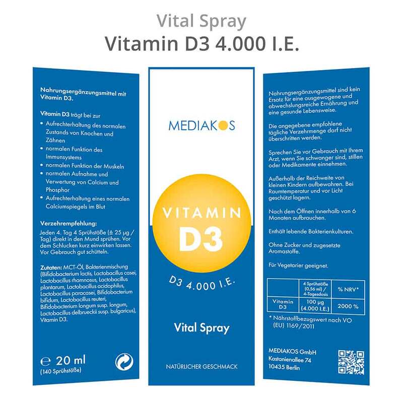 Das Vitamin D3 4.000 I.E. Vital Spray ist ein hochwertiges Nahrungsergänzungsmittel, das täglich als Mundspray angewendet wird und den Körper mit dem lebenswichtigen Vitamin D versorgt. Es kombiniert Vitamin D (Cholecalciferol) mit MCT-Öl (Kokosöl), um die Gesundheit von Knochen und Zähnen, die normale Funktion des Immunsystems und der Muskeln sowie die normale Aufnahme und Verwertung von Calcium und Phosphor zu unterstützen.*