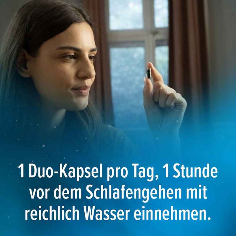 1 Duo-Kapsel pro Tag, 1 Stunde vot dem Schlafengehen mit reichlich Wasser verzehren.