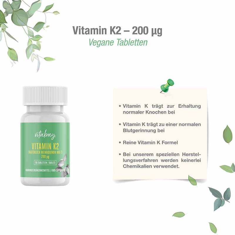 Vitamin K gehört wie auch Vitamin A, D und E zu den fettlöslichen Vitaminen. Um die Aufnahme der Vitamine zu steigern, empfiehlt sich daher der gleichzeitige Verzehr von gesunden Fetten und Ölen. Vitamin K2 ist in erster Linie ein Faktor für die Erhaltung normaler Knochen und eine normale Blutgerinnung.* Allerdings wird nicht jede Vitamin-K2-Quelle gleich verwertet. Um die Bioverfügbarkeit und somit die Verwertung unserer Vitamin-K2-Quelle zu erhöhen, bedient sich das Vitabay-Forschungsteam der natürlichen K2-Quelle aus dem japanischen Lebensmittel Natto. Somit ist es Vitabay gelungen, eine hervorragende Bioverfügbarkeit dieses wichtigen Vitamins zu erreichen.