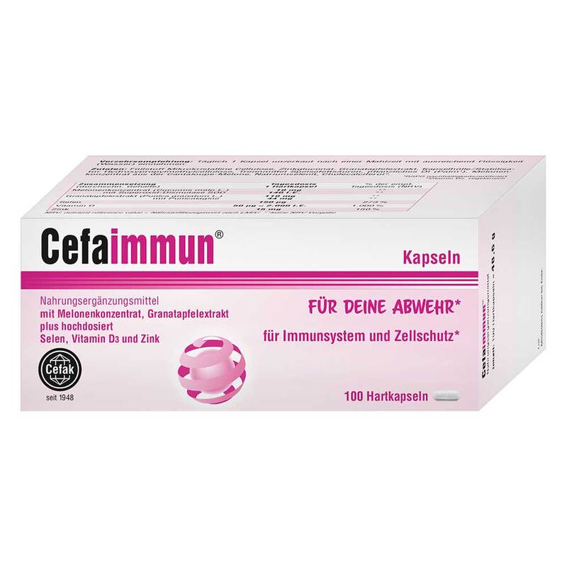 Wertvolle Extrakte aus der Cantaloupe-Melone und dem Granatapfel bilden zusammen mit den hochdosierten Spurenelementen Selen und Zink sowie dem Sonnenvitamin D3 eine hochwertige Immunkombination für die tägliche Versorgung. Dabei genügt die Einnahme einer Kapsel nach einer Mahlzeit. Cefaimmun ist für Vegetarier geeignet.
