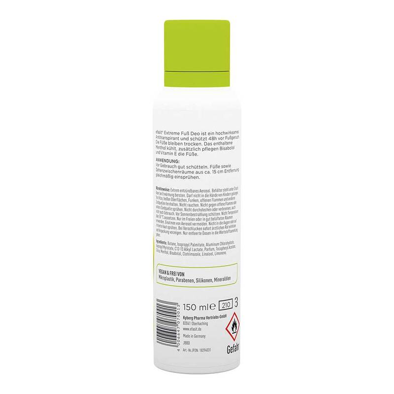 Efasit Extreme Fuß Deo ist ein hochwirksames Antitranspirant und schützt 48h lang vor Fußgeruch. Die Füße bleiben trocken. Das enthaltene Menthol kühlt, zusätzlich pflegen Bisabolol und Vitamin E die Füße.
