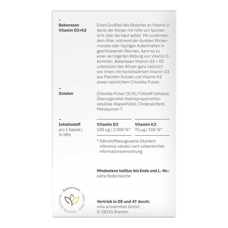 Eine Kapsel Bakanasan Vitamin D3 + K2 unterstützt den Körper ganz natürlich von innen mit hochdosierten 100 µg Vitamin D (4.000 I.E.) und 75 µg Vitamin K2 sowie natürlichem Chlorella-Pulver.