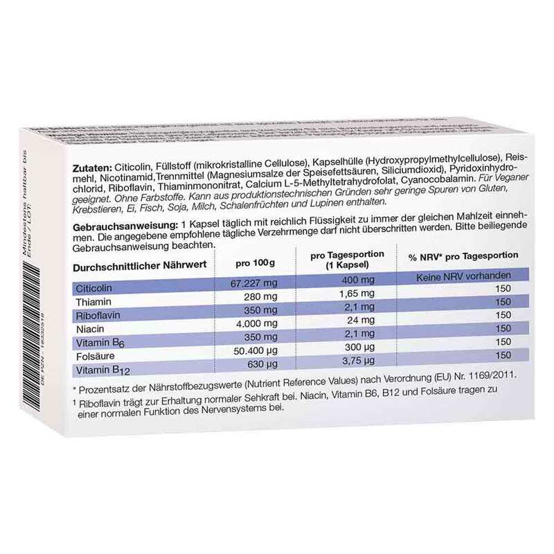Citicolin, Kapselhülle (Hydroxypropylmethylcellulose), Reismehl, Nicotinamid, Trennmittel, (Magnesiumsalze der Speisefettsäuren, Siliciumdioxid), Pyridoxinhydrochlorid, Riboflavin, Thiaminmononitrat, Calcium L-5-Methyltetrahydrofolat, Cyanocobalamin.