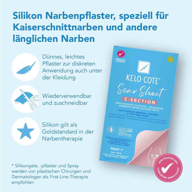 Anwendungsgebiete:KELO-COTE® Silikon-Narbenpflaster Kaiserschnitt ist für die Prävention und Behandlung frischer Narben, einschließlich hypertropher Narben und Keloiden, nach Kaiserschnitt, allgemeinen chirurgischen Eingriffen, nach ästhetischen Eingriffen, bei Verletzungen, Wunden und Verbrennungen bestimmt. KELO-COTE® Silikon-Narbenpflaster Kaiserschnitt ist auch für die Anwendung auf empfindlicher Haut geeignet.