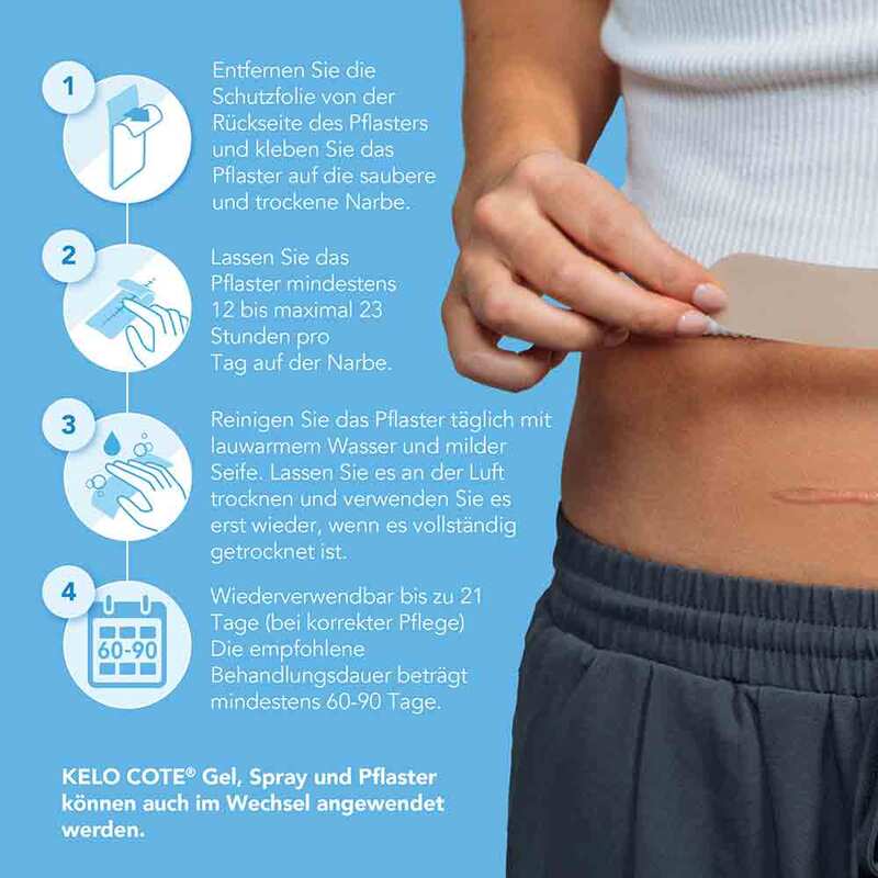 KELO-COTE® Silikon-Narbenpflaster Kaiserschnitt können im Wechsel mit KELO-COTE® Narbengel und Spray verwendet werden. Der Wechsel kann z.B. im Tag/Nacht Rhythmus erfolgen. Silikon-Narbenpflaster, Gele und Spray sollten aber nicht gleichzeitig (übereinander/mehrschichtig) verwendet werden.