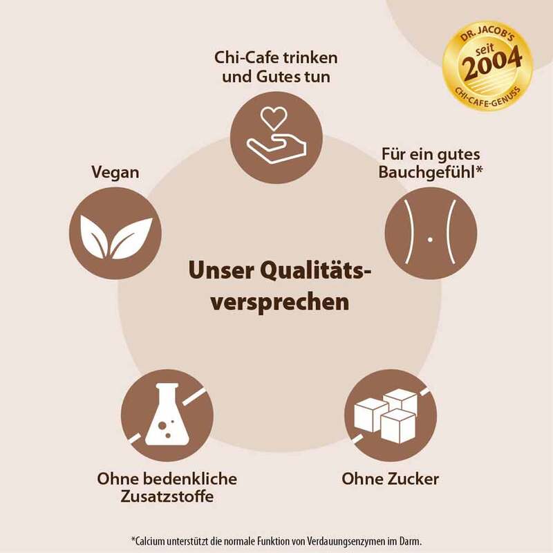 Chi-Cafe ist vegan sowie frei von Gluten und Laktose. Die meisten Sorten enthalten Akazienfaser-Ballaststoffe, die dem Chi-Cafe eine einmalige Cremigkeit verleihen. Diese werden kombiniert mit gesunden Mineralstoffen und wertvollen Pflanzenextrakten.