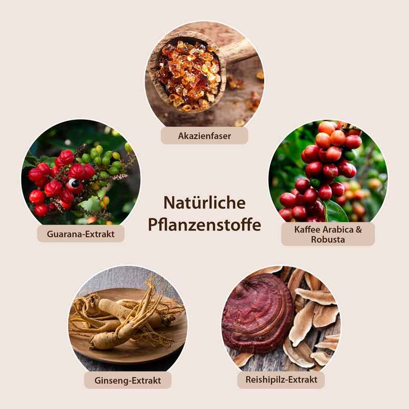 Cremiger Kaffee-Genuss mit Reishi-Pilz, Kokos, Magnesium, Vitamin B12 sowie aromatisierenden Pflanzenextrakten.